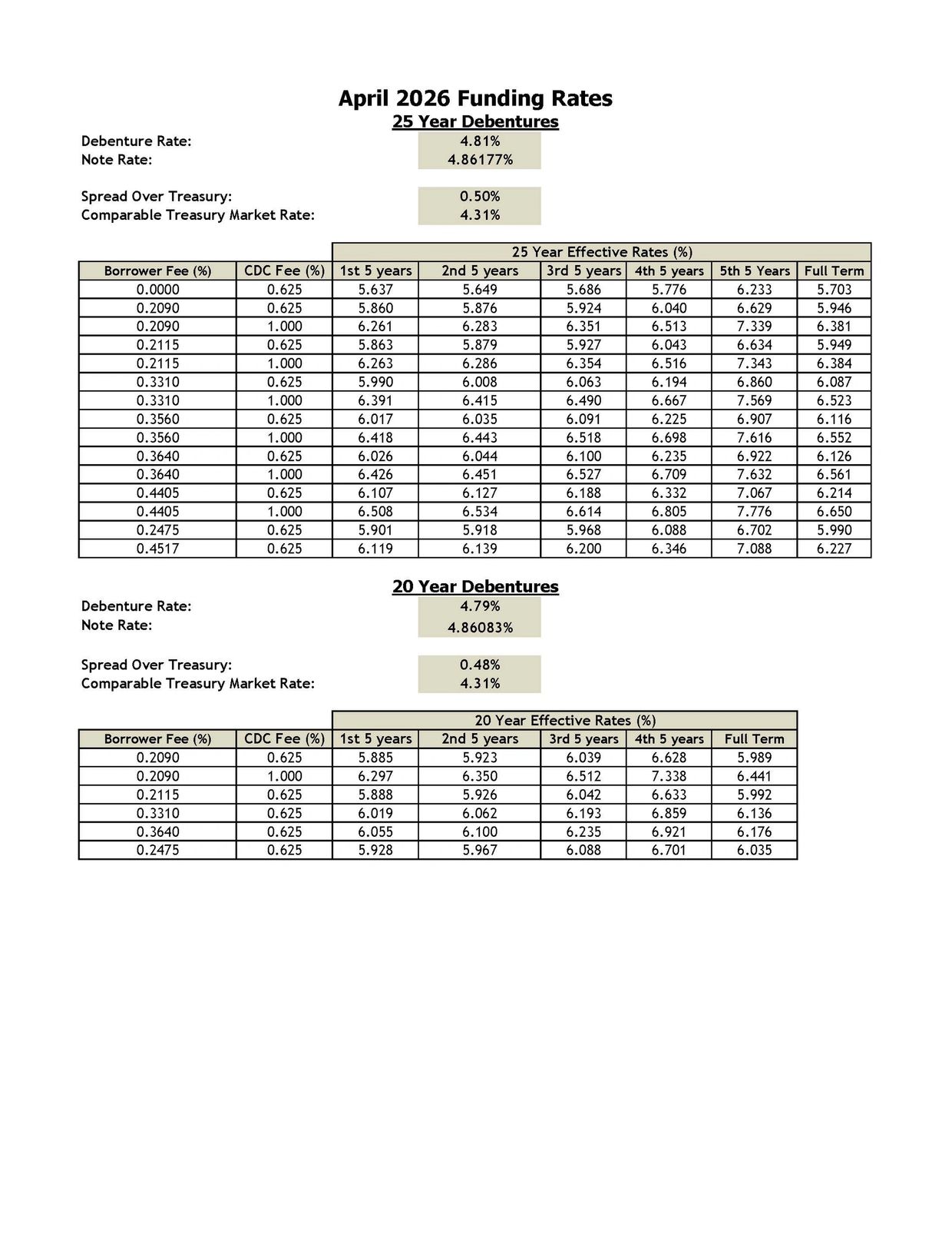 Effective interest rates are calculated by the Central Servicing Agent after receipt of debenture pricing provided by the Fiscal Agent every month. They are posted here as soon possible and should usually be available the day prior to funding, at the latest. Twenty and twenty five-year debentures are pooled and sold the first Thursday of the first full week of each month (beginning with and including Sunday). 10-year debentures are pooled and sold the first Thursday of the first full week of every other month (beginning with and including Sunday) starting with the January sale.